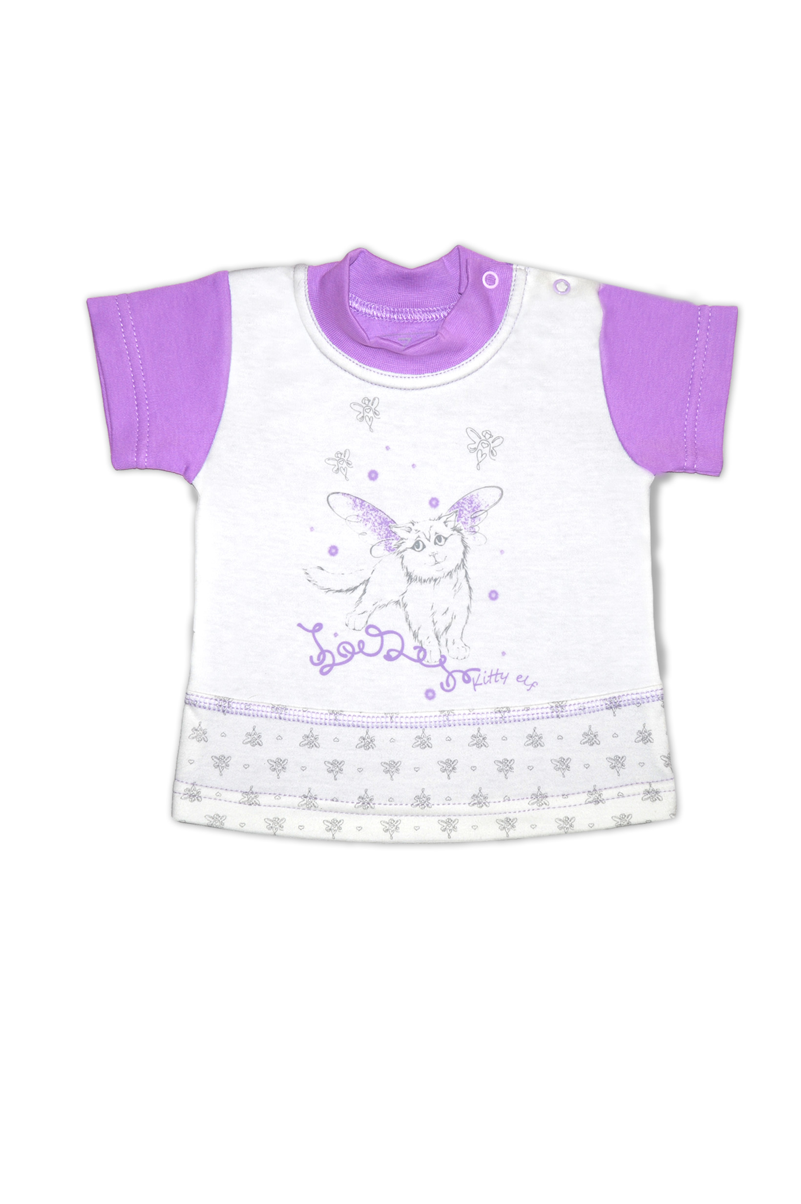 Футболка для малыша из трикотажного полотна высшего качества. Гипоаллергенный дизайнерский принт в виде кошечки-эльфа отлично сочетается с набивным рисунком. Удобное расположение кнопок для переодевания малыша. Состав 100% хлопок. Рекомендиции по уходу: стирать при 40 С, гладить при средней температуре, носить с удовольствием.